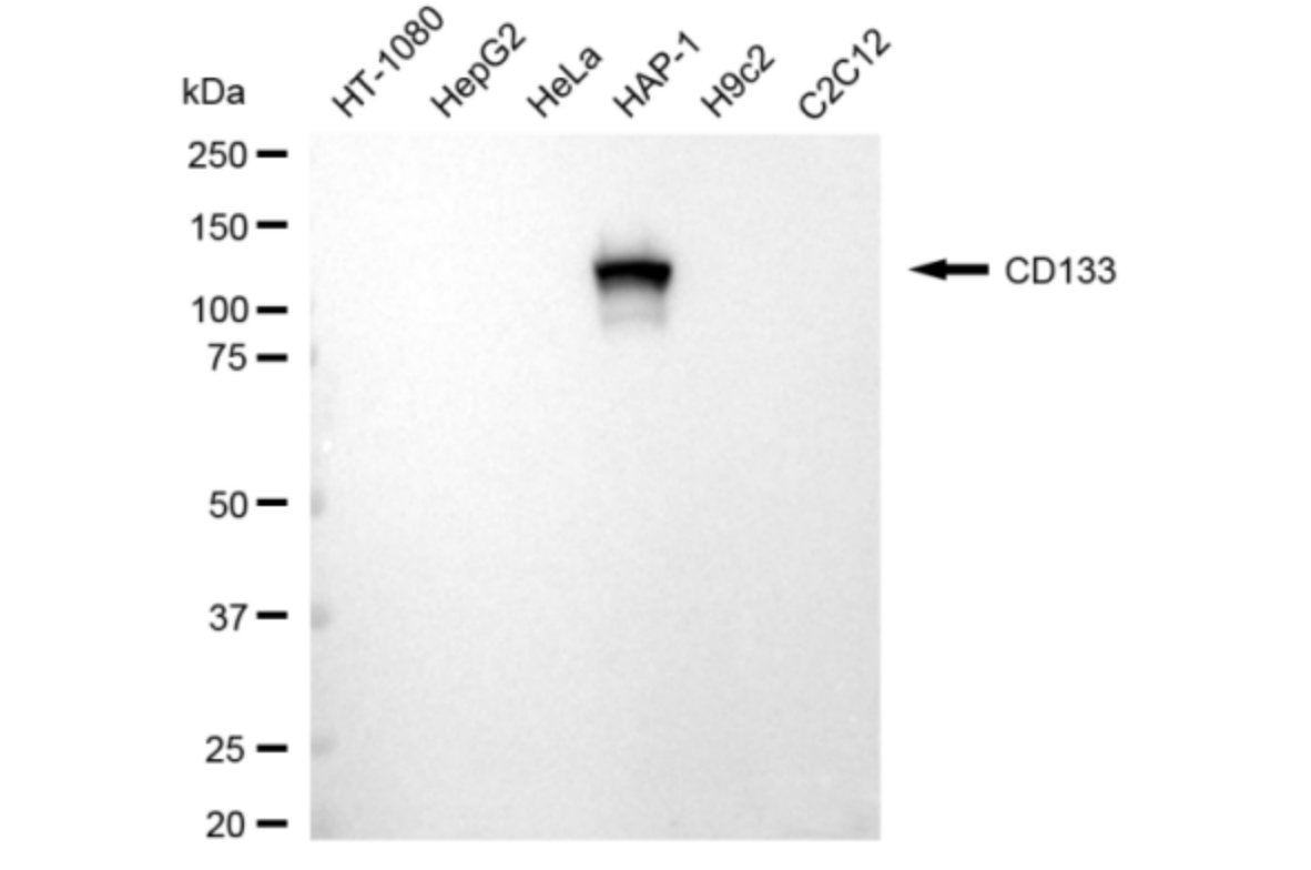 • Western blotting analysis using CD133 antibody. Total cell lysates (30 μg) from various cell lines were loaded and separated by SDS-PAGE. The blot was incubated with CD133 antibody and HRP-conjugated goat anti-rabbit secondary antibody respectively.
