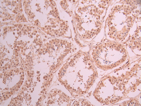 IHC image of CSB-RA904109A0HU diluted at 1:100 and staining in paraffin-embedded human testis tissue performed on a Leica BondTM system. After dewaxing and hydration, antigen retrieval was mediated by high pressure in a citrate buffer (pH 6.0). Section was blocked with 10% normal goat serum 30min at RT. Then primary antibody (1% BSA) was incubated at 4°C overnight. The primary is detected by a Goat anti-rabbit polymer IgG labeled by HRP and visualized using 0.05% DAB.
