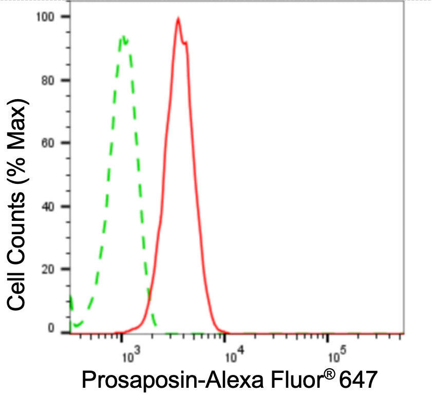 Flow cytometric analysis of prosaposin expression in HepG2 cells using prosaposin antibody. Green, isotype control; red, prosaposin.