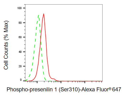 Flow cytometric analysis of phospho-presenilin 1 (Ser310) expression in HeLa cells using phospho-presenilin 1 (Ser310) antibody. Green, isotype control; red, phospho-presenilin 1 (Ser310).