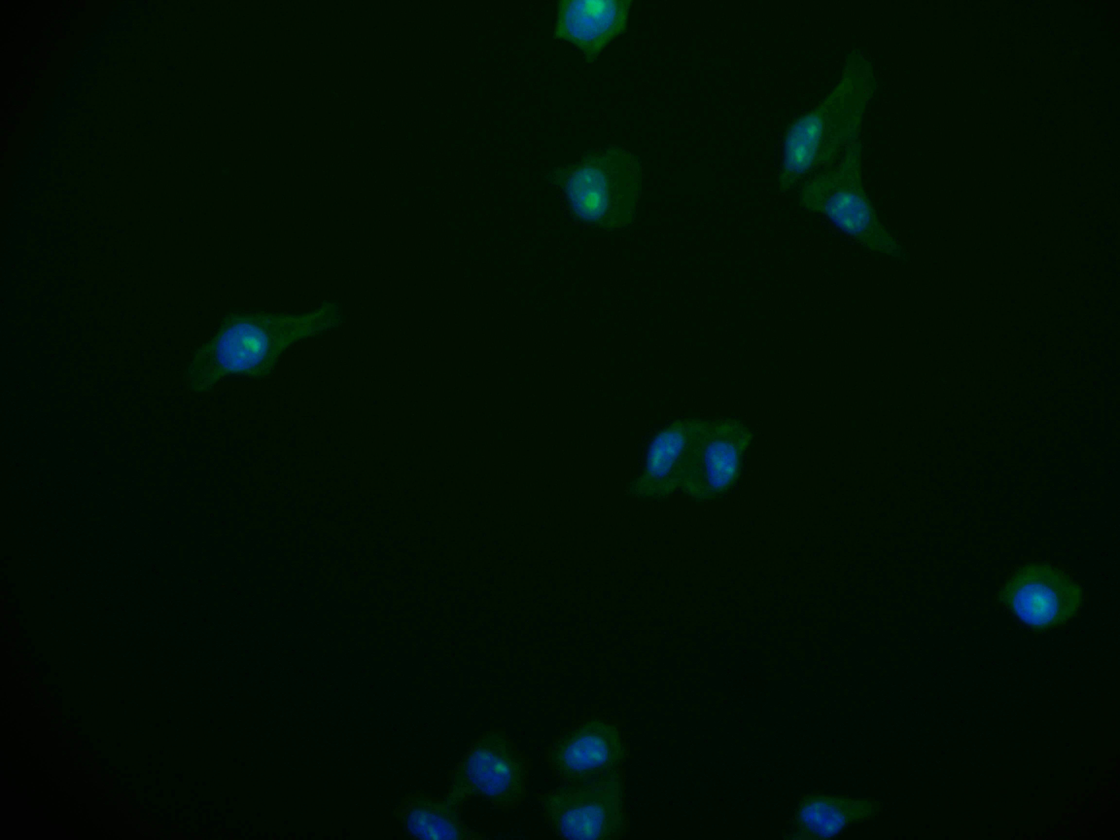 • Immunofluorescence staining of HepG2 cell with CSB-RA943230A0HU at 1:50, counter-stained with DAPI. The cells were fixed in 4% formaldehyde and blocked in 10% normal Goat Serum. The cells were then incubated with the antibody overnight at 4°C. The secondary antibody was Alexa Fluor 518-congugated AffiniPure Goat Anti-Rabbit IgG(H+L).