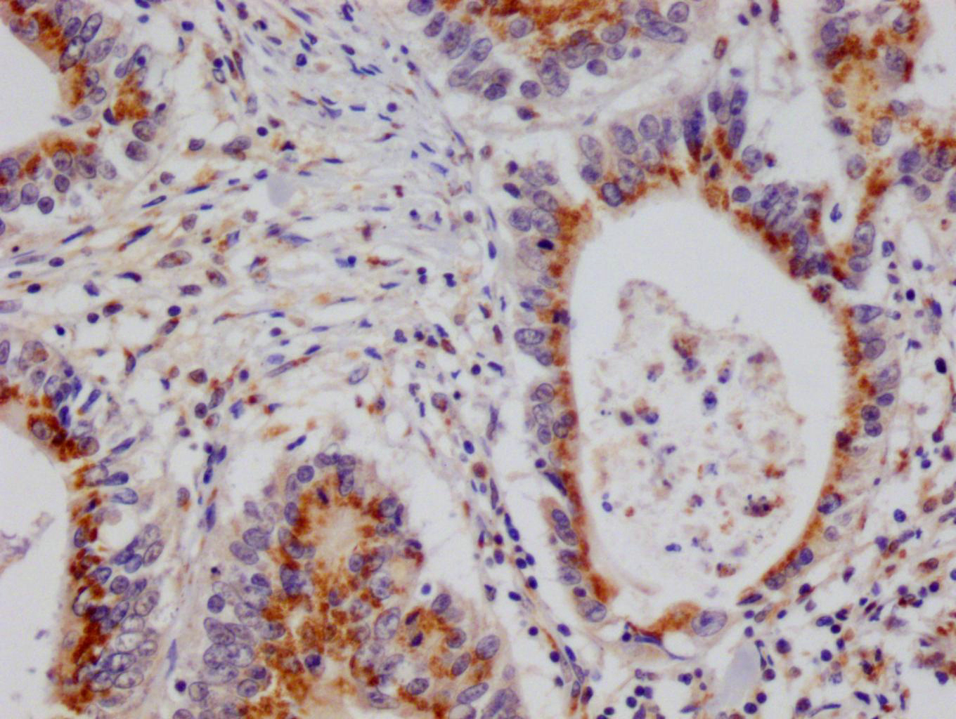 • IHC image of CSB-RA943230A0HU diluted at 1:100 and staining in paraffin-embedded human colon cancer performed on a Leica BondTM system. After dewaxing and hydration, antigen retrieval was mediated by high pressure in a citrate buffer (pH 6.0). Section was blocked with 10% normal goat serum 30min at RT. Then primary antibody (1% BSA) was incubated at 4°C overnight. The primary is detected by a Goat anti-rabbit polymer IgG labeled by HRP and visualized using 0.05% DAB.