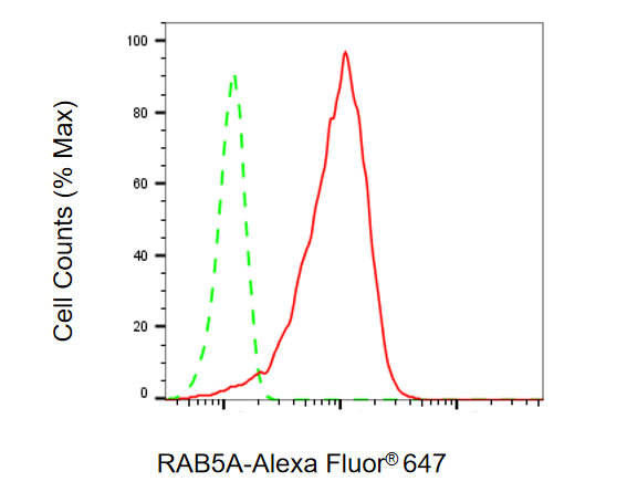 • Flow cytometric analysis of RAB5A expression in HepG2 cells using RAB5A antibody. Green, isotype control; red, RAB5A.