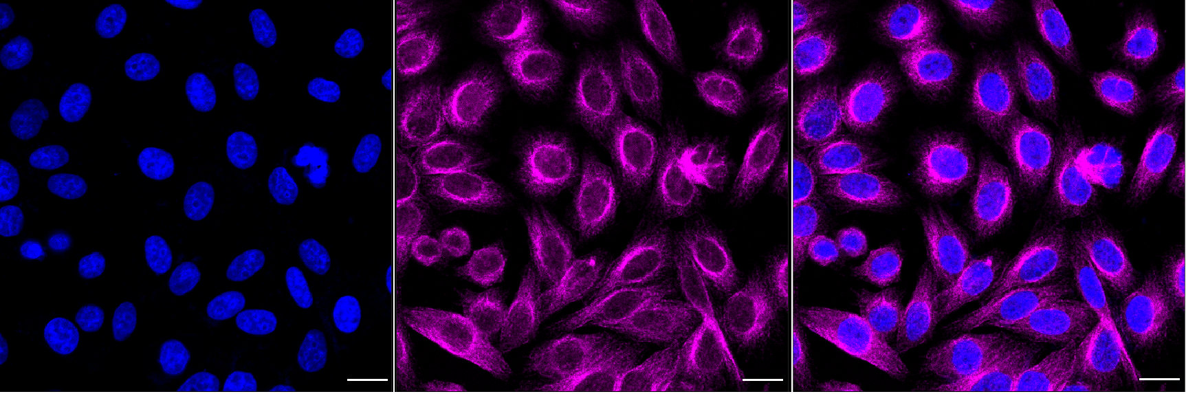 • Immunocytochemical staining of HepG2 cells with RAB5A antibody. Nuclei were stained blue with DAPI; RAB5A was stained magenta with Alexa Fluor? 647. Images were taken using Leica stellaris 5. Protein abundance based on laser Intensity and smart gain: Medium. Scale bar, 20 μm.