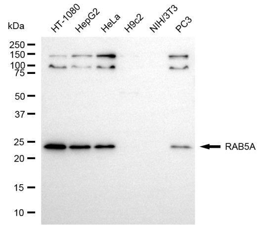 • Western blotting analysis using RAB5A antibody. Total cell lysates (30 μg) from various cell lines were loaded and separated by SDS-PAGE. The blot was incubated with RAB5A antibody and HRP-conjugated goat anti-rabbit secondary antibody respectively.