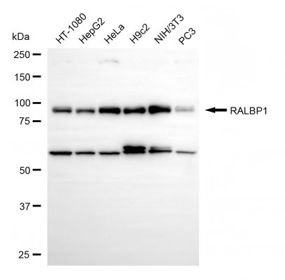 Western blotting analysis using RALBP1 antibody. Total cell lysates (30 μg) from various cell lines were loaded and separated by SDS-PAGE. The blot was incubated with RALBP1 antibody and HRP-conjugated goat anti-rabbit secondary antibody respectively.