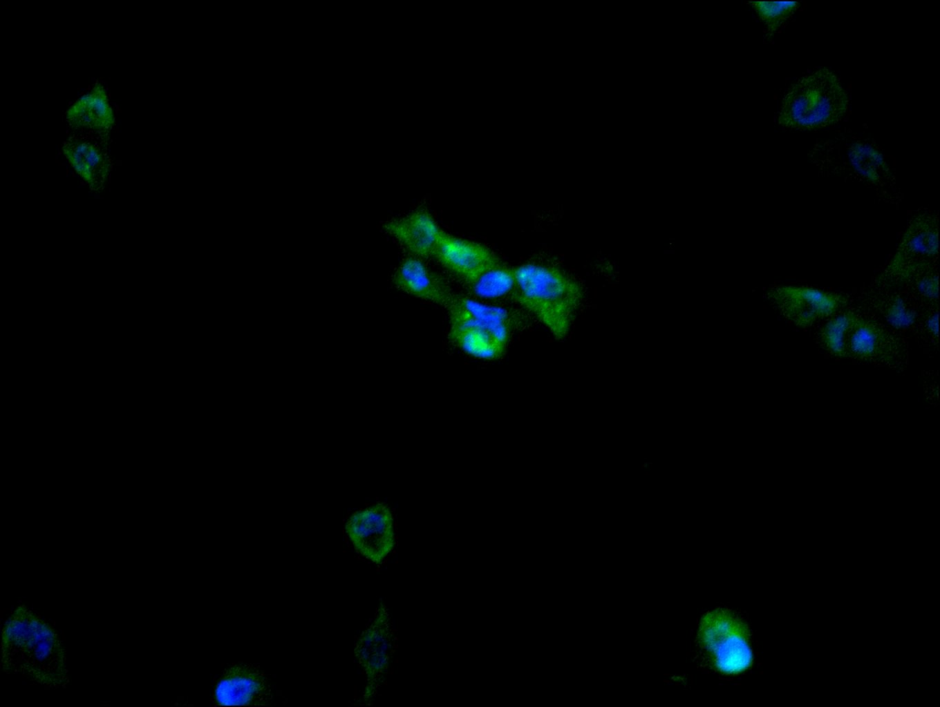 Immunofluorescence staining of A-431 cell with CSB-RA831539A0HU at 1:50, counter-stained with DAPI. The cells were fixed in 4% formaldehyde, permeabilized using 0.2% Triton X-100 and blocked in 10% normal Goat Serum. The cells were then incubated with the antibody overnight at 4°C. The secondary antibody was Alexa Fluor 488-congugated AffiniPure Goat Anti-Rabbit IgG(H+L).