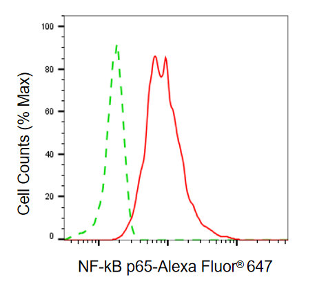 Flow cytometric analysis of NF-kB p65 expression in HepG2 cells using NF-kB p65 antibody. Green, isotype control; red, NF-kB p65.