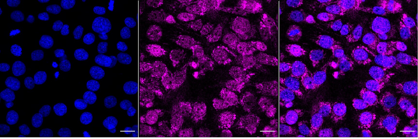 Immunocytochemical staining of HepG2 cells with NF-kB p65 antibody. Nuclei were stained blue with DAPI; NF-kB p65 was stained magenta with Alexa Fluor? 647. Images were taken using Leica stellaris 5. Protein abundance based on laser Intensity and smart gain: Medium. Scale bar, 20 μm.