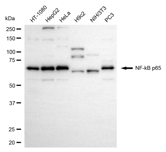 Western blotting analysis using NF-kB p65 antibody. Total cell lysates (30 μg) from various cell lines were loaded and separated by SDS-PAGE. The blot was incubated with NF-kB p65 antibody and HRP-conjugated goat anti-rabbit secondary antibody respectively.
