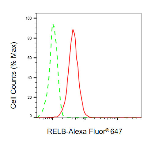 • Flow cytometric analysis of RELB expression in C2C12 cells using RELB antibody. Green, isotype control; red, RELB.