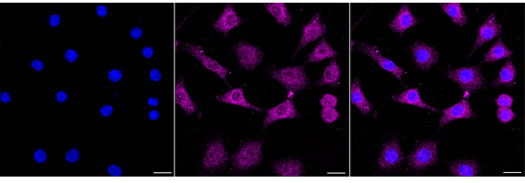 • Immunocytochemical staining of C2C12 cells with RELB antibody. Nuclei were stained blue with DAPI; RELB was stained magenta with Alexa Fluor? 647. Images were taken using Leica stellaris 5. Protein abundance based on laser Intensity and Smart Gain: Medium. Scale bar, 20 μm.