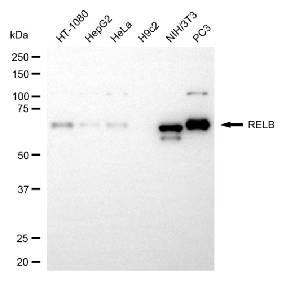 • Western blotting analysis using RELB antibody. Total cell lysates (30 μg) from various cell lines were loaded and separated by SDS-PAGE. The blot was incubated with RELB antibody and HRP-conjugated goat anti-rabbit secondary antibody respectively.