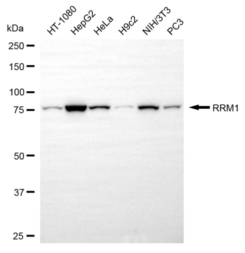 Western blotting analysis using RRM1 antibody. Total cell lysates (30 μg) from various cell lines were loaded and separated by SDS-PAGE. The blot was incubated with RRM1 antibody and HRP-conjugated goat anti-rabbit secondary antibody respectively.