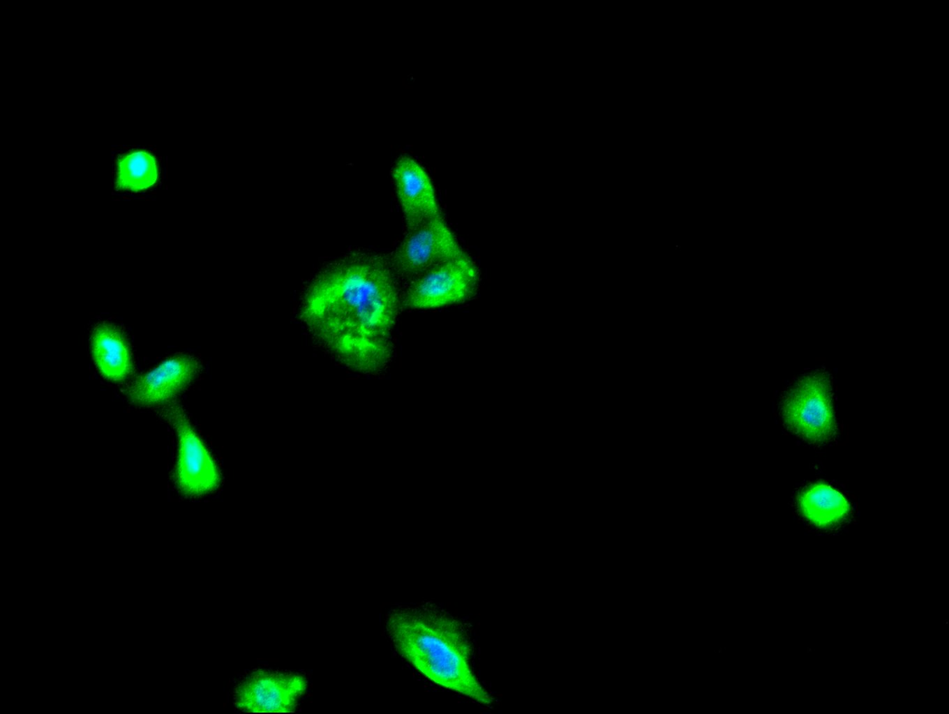 • Immunofluorescence staining of A-431 cell with CSB-RA278193A0HU at 1:50, counter-stained with DAPI. The cells were fixed in 4% formaldehyde, permeabilized using 0.2% Triton X-100 and blocked in 10% normal Goat Serum. The cells were then incubated with the antibody overnight at 4°C. The secondary antibody was Alexa Fluor 488-congugated AffiniPure Goat Anti-Rabbit IgG(H+L).