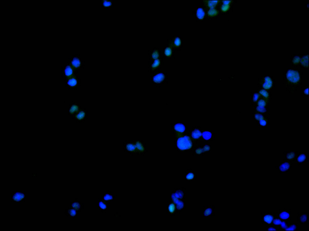 Immunofluorescence staining of HepG2 cell with CSB-RA947248A0HU at 1:50, counter-stained with DAPI. The cells were fixed in 4% formaldehyde, permeabilized using 0.2% Triton X-100 and blocked in 10% normal Goat Serum. The cells were then incubated with the antibody overnight at 4°C. The secondary antibody was Alexa Fluor 488-congugated AffiniPure Goat Anti-Rabbit IgG(H+L).