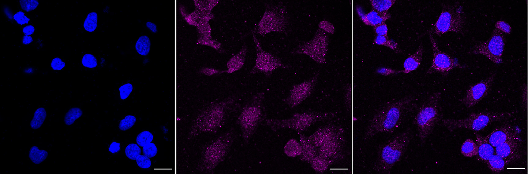 Immunocytochemical staining of HeLa cells with SAMM50 antibody. Nuclei were stained blue with DAPI; SAMM50 was stained magenta with Alexa Fluor? 647. Images were taken using Leica stellaris 5. Protein abundance based on laser Intensity and smart gain: Medium. Scale bar, 20 μm.