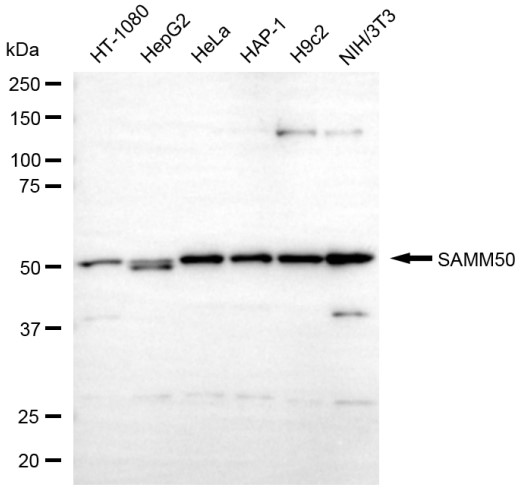 Western blotting analysis using SAMM50 antibody. Total cell lysates (30 μg) from various cell lines were loaded and separated by SDS-PAGE. The blot was incubated with SAMM50 antibody and HRP-conjugated goat anti-rabbit secondary antibody respectively.
