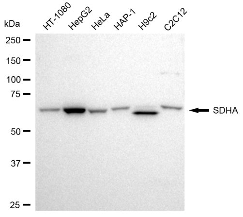 Western blotting analysis using SDHA antibody. Total cell lysates (30 μg) from various cell lines were loaded and separated by SDS-PAGE. The blot was incubated with SDHA antibody and HRP-conjugated goat anti-rabbit secondary antibody respectively. SDHA, succinate dehydrogenase complex flavoprotein subunit A.