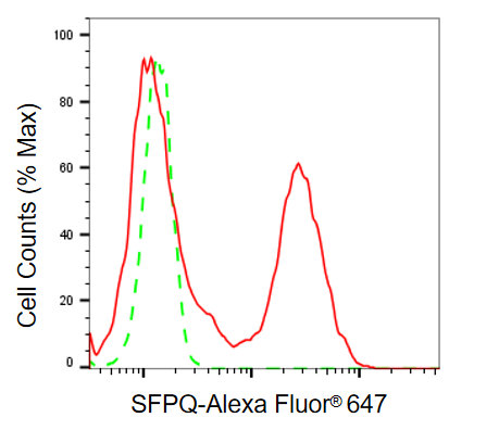 Flow cytometric analysis of SFPQ expression in HepG2 cells using SFPQ antibody. Green, isotype control; red, SFPQ.