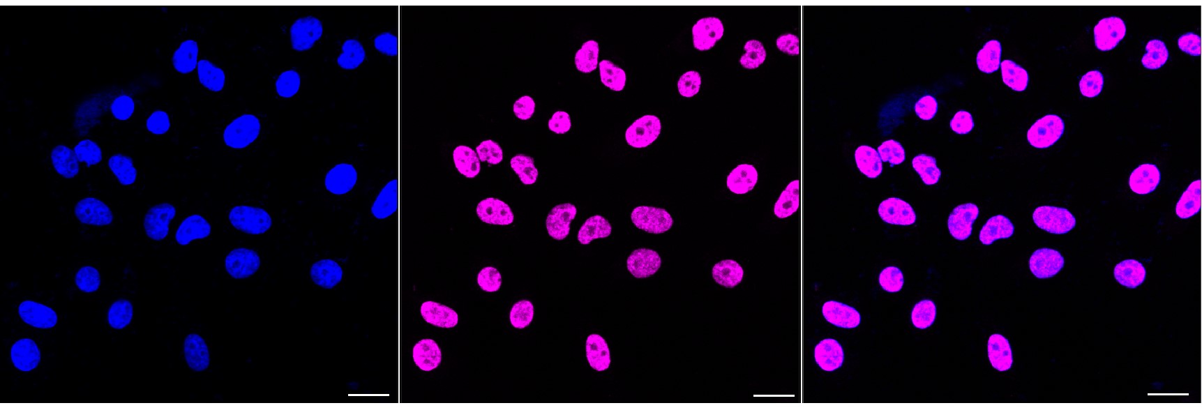 Immunocytochemical staining of HepG2 cells with SFPQ antibody. Nuclei were stained blue with DAPI; SFPQ was stained magenta with Alexa Fluor? 647. Images were taken using Leica stellaris 5. Protein abundance based on laser Intensity and smart gain: High. Scale bar, 20 μm.