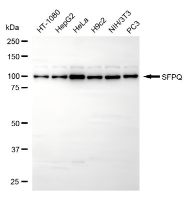 Western blotting analysis using SFPQ antibody. Total cell lysates (20 μg) from various cell lines were loaded and separated by SDS-PAGE. The blot was incubated with SFPQ antibody and HRP-conjugated goat anti-rabbit secondary antibody respectively.