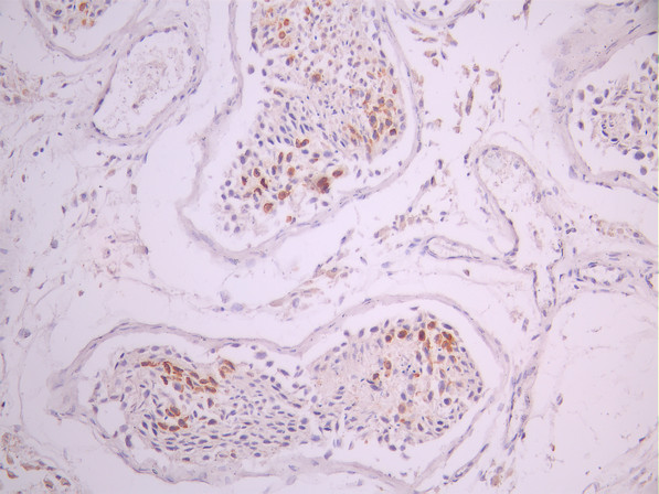 IHC image of CSB-RA112927A0HU diluted at 1:100 and staining in paraffin-embedded human testis tissue performed on a Leica BondTM system. After dewaxing and hydration, antigen retrieval was mediated by high pressure in a citrate buffer (pH 6.0). Section was blocked with 10% normal goat serum 30min at RT. Then primary antibody (1% BSA) was incubated at 4°C overnight. The primary is detected by a Goat anti-rabbit polymer IgG labeled by HRP and visualized using 0.05% DAB.