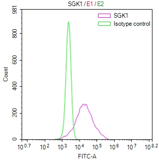 • Overlay Peak curve showing Hela cells stained with CSB-RA021189MA1HU (red line) at 1:100. The cells were fixed in 4% formaldehyde and permeated by 0.2% TritonX-100 for 10min. Then 10% normal goat serum to block non-specific protein-protein interactions followed by the antibody (1ug/1*106cells) for 45min at 4℃. The secondary antibody used was Fluorescein (FITC) AffiniPure Goat Anti-Human IgG, Fcγ fragment specific at 1:200 dilution for 35 min at 4℃.Control antibody (green line) was human IgG1 (1ug/1*106cells) used under the same conditions. Acquisition of >10,000 events was performed.