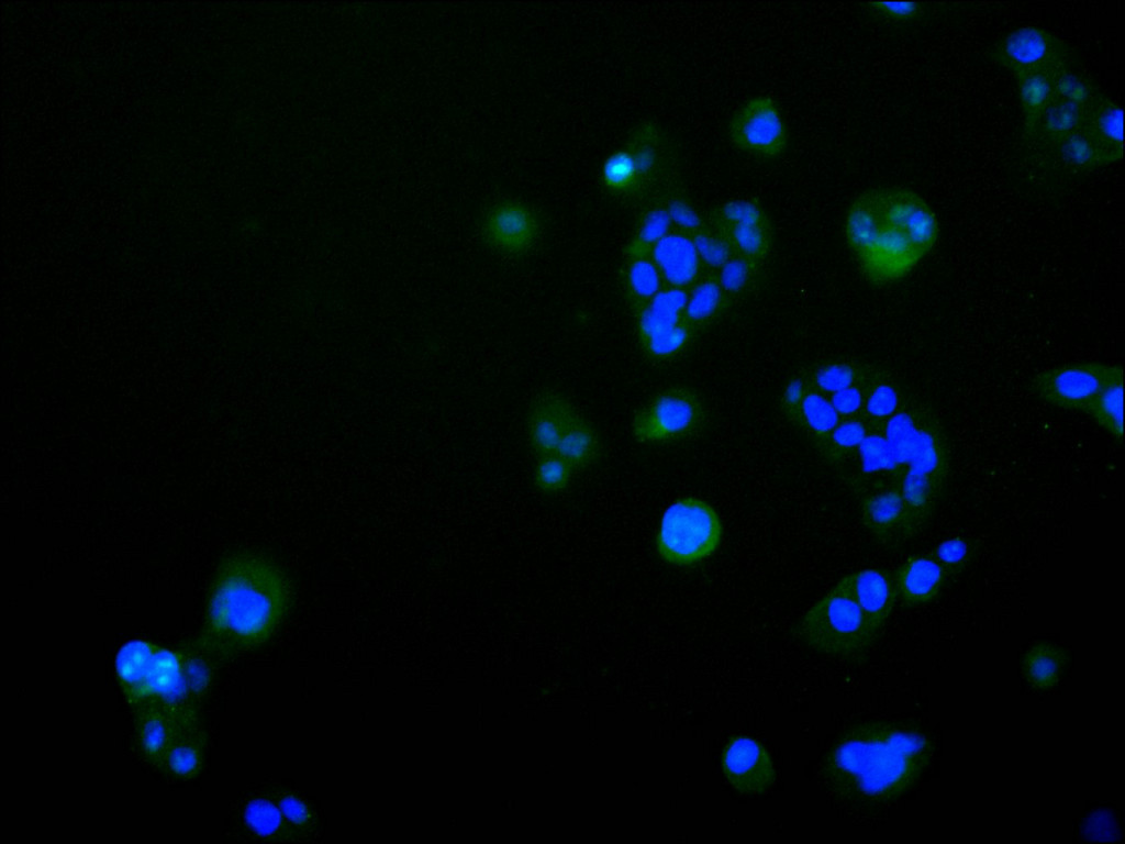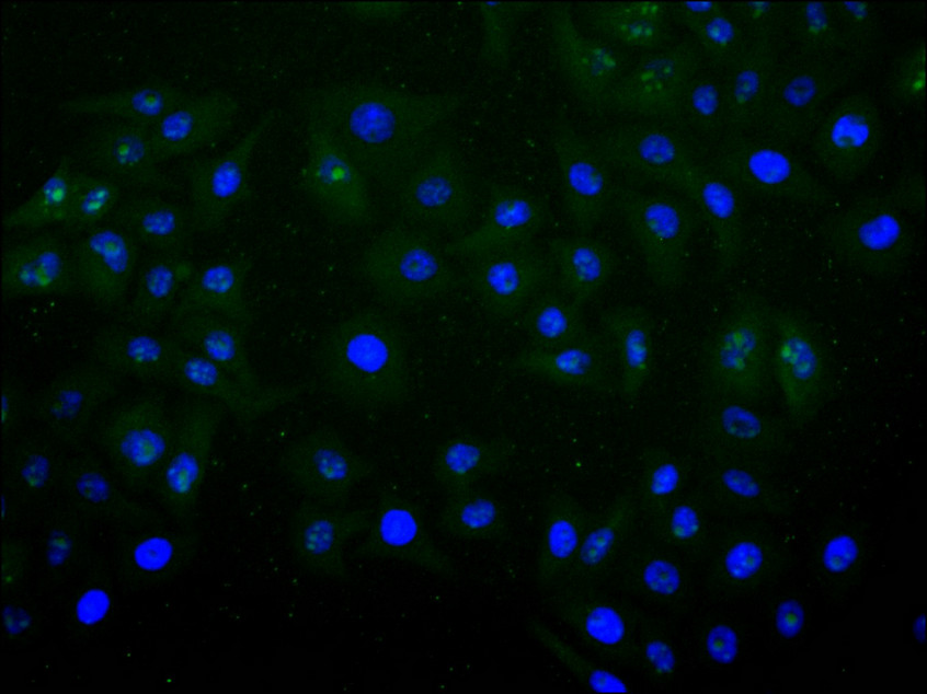 • Immunofluorescence staining of Hela cell with CSB-RA021189MA1HU at 1:30 ,counter-stained with DAPI. The cells were fixed in 4% formaldehyde, permeabilized using 0.2% Triton X-100 and blocked in 10% normal Goat Serum. The cells were then incubated with the antibody overnight at 4°C. The secondary antibody was Alexa Fluor 488-congugated AffiniPure Goat Anti-Human IgG(H+L).