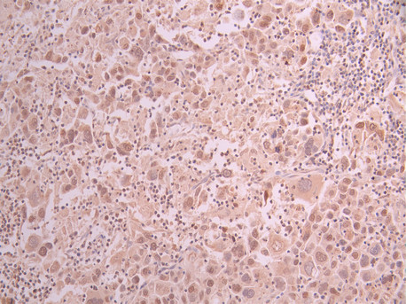 IHC image of CSB-RA262791A0HU diluted at 1:100 and staining in paraffin-embedded human liver cancer performed on a Leica BondTM system. After dewaxing and hydration, antigen retrieval was mediated by high pressure in a citrate buffer (pH 6.0). Section was blocked with 10% normal goat serum 30min at RT. Then primary antibody (1% BSA) was incubated at 4°C overnight. The primary is detected by a Goat anti-rabbit polymer IgG labeled by HRP and visualized using 0.05% DAB.