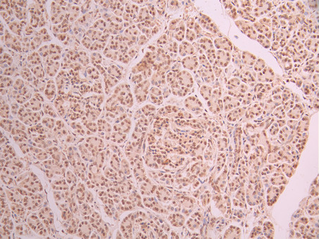 IHC image of CSB-RA262791A0HU diluted at 1:100 and staining in paraffin-embedded human pancreatic tissue performed on a Leica BondTM system. After dewaxing and hydration, antigen retrieval was mediated by high pressure in a citrate buffer (pH 6.0). Section was blocked with 10% normal goat serum 30min at RT. Then primary antibody (1% BSA) was incubated at 4°C overnight. The primary is detected by a Goat anti-rabbit polymer IgG labeled by HRP and visualized using 0.05% DAB.