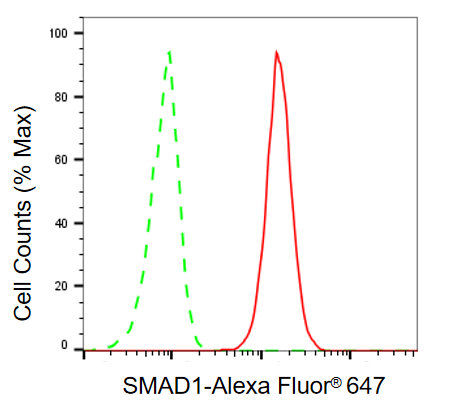 • Flow cytometric analysis of SMAD1 expression in HAP-1 cells using SMAD1 antibody. Green, isotype control; red, SMAD1.