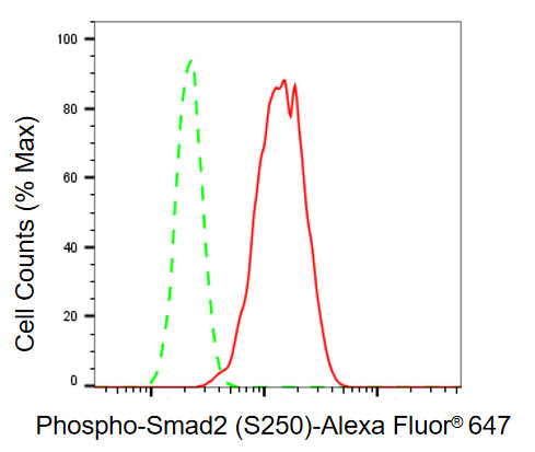 • Flow cytometric analysis of phospho-Smad2 (S250) expression in C2C12 cells using phospho-Smad2 (S250) antibody. Green, isotype control; red, phospho-Smad2 (S250).