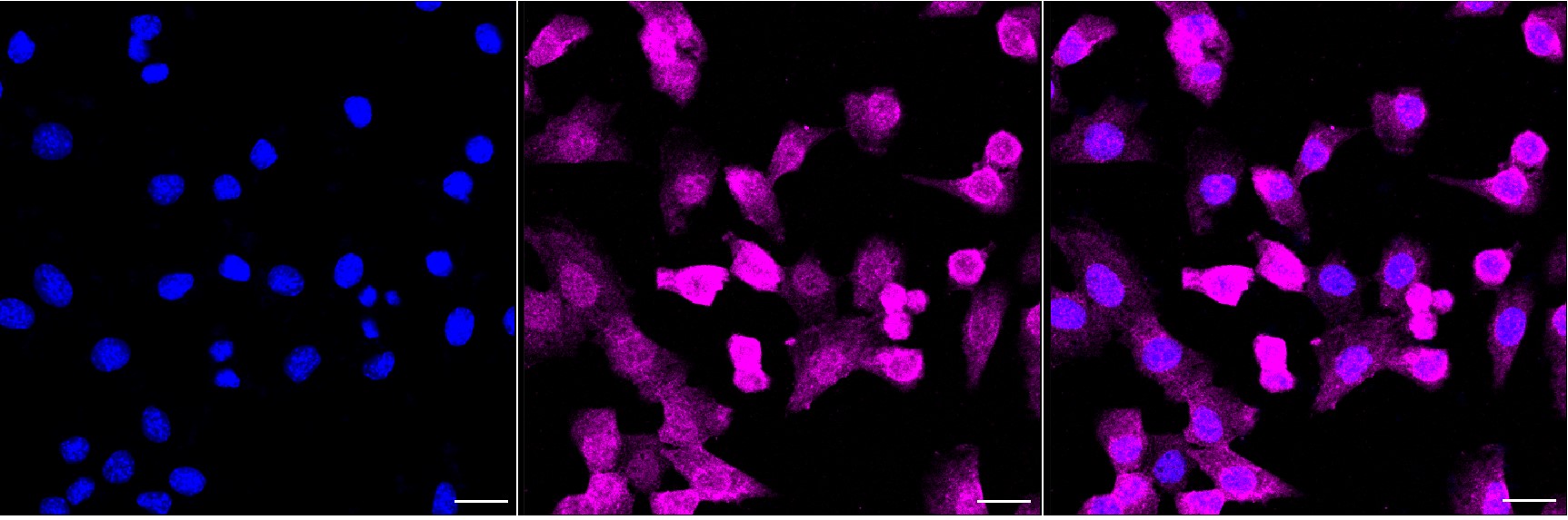 • Immunocytochemical staining of C2C12 cells with Phospho-Smad2 (S250) antibody. Nuclei were stained blue with DAPI; Phospho-Smad2 (S250) was stained magenta with Alexa Fluor? 647. Images were taken using Leica stellaris 5. Protein abundance based on laser Intensity and smart gain: Medium. Scale bar, 20 μm.