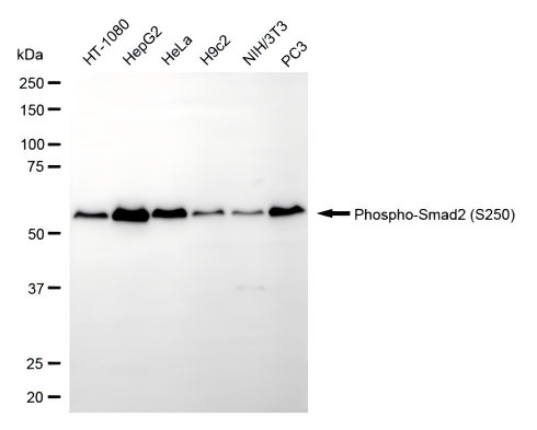 • Western blotting analysis using phospho-Smad2 (S250) antibody. Total cell lysates (30 μg) from various cell lines were loaded and separated by SDS-PAGE. The blot was incubated with phospho-Smad2 (S250) antibody and HRP-conjugated goat anti-rabbit secondary antibody respectively.
