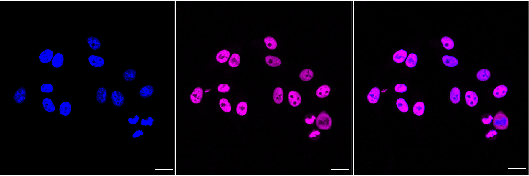 Immunocytochemical staining of HepG2 cells with SMARCA4 antibody. Nuclei were stained blue with DAPI; SMARCA4 was stained magenta with Alexa Fluor? 647. Images were taken using Leica stellaris 5. Protein abundance based on laser Intensity and smart gain: High. Scale bar, 20 μm.