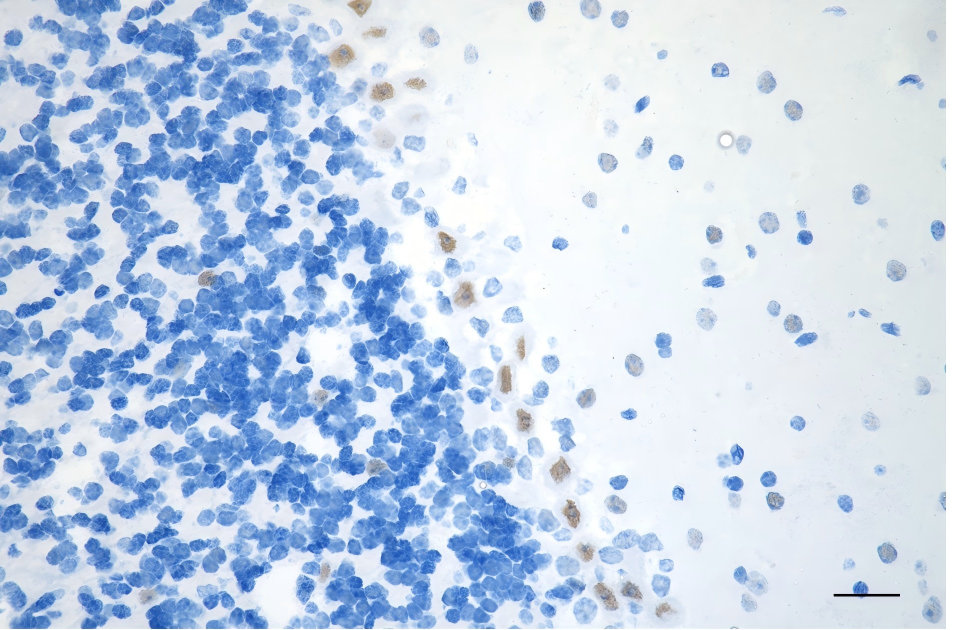 Immunohistochemistry was performed on paraffin-embedded mouse brain using SMARCA4 antibody. Antigen retrieval was done in sodium citrate buffer (pH 6.0). DAB was used for detection, with hematoxylin counterstaining. Images were acquired using a Nikon Ci-L Plus microscope (40× objective). Scale bar: 25 μm.
