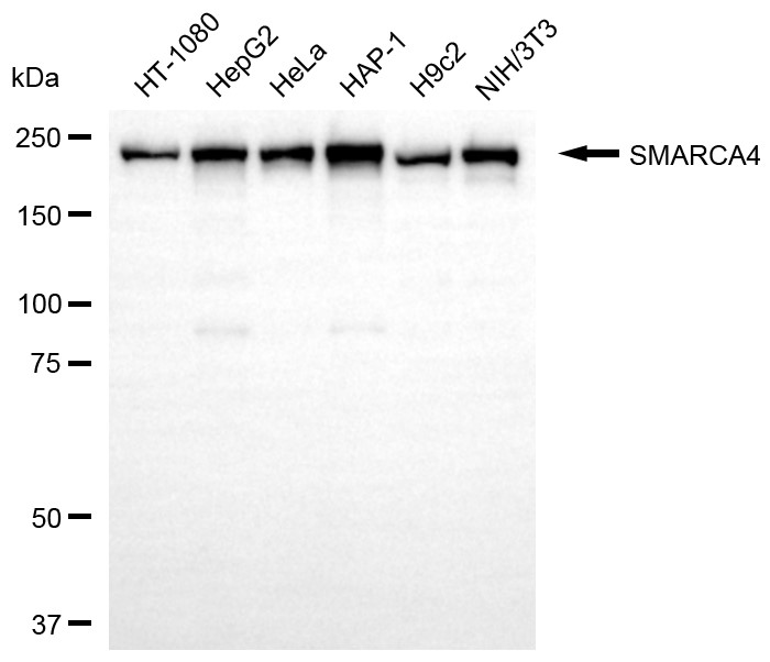 Western blotting analysis using SMARCA4 antibody. Total cell lysates (30 μg) from various cell lines were loaded and separated by SDS-PAGE. The blot was incubated with SMARCA4 antibody and HRP-conjugated goat anti-rabbit secondary antibody respectively.