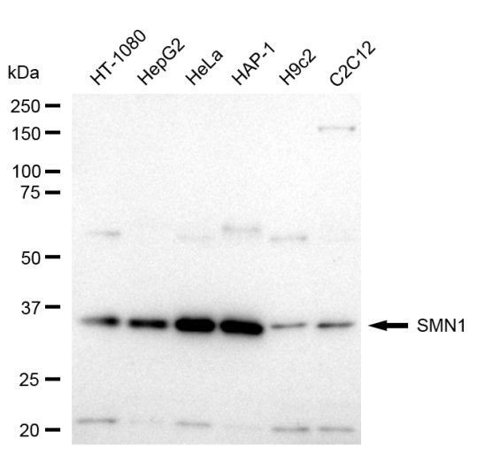 Western blotting analysis using SMN1 antibody. Total cell lysates (30 μg) from various cell lines were loaded and separated by SDS-PAGE. The blot was incubated with SMN1 antibody and HRP-conjugated goat anti-rabbit secondary antibody respectively.