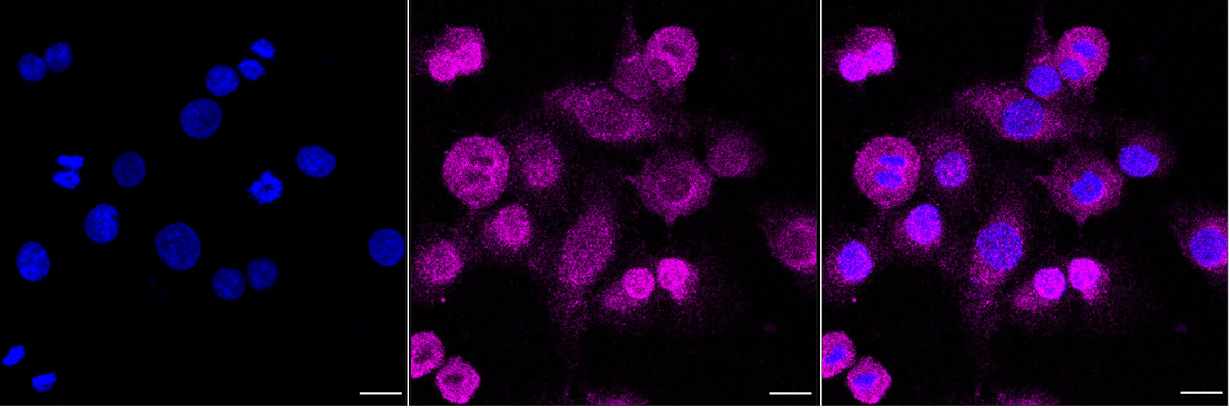 Immunocytochemical staining of HT-1080 cells with synaptosome associated protein 25 antibody. Nuclei were stained blue with DAPI; Synaptosome associated protein 25 was stained magenta with Alexa Fluor? 647. Images were taken using Leica stellaris 5. Protein abundance based on laser Intensity and smart gain: Medium. Scale bar, 20 μm.
