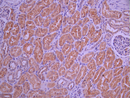 IHC image of CSB-RA976720A0HU diluted at 1:100 and staining in paraffin-embedded human kidney tissue performed on a Leica BondTM system. After dewaxing and hydration, antigen retrieval was mediated by high pressure in a citrate buffer (pH 6.0). Section was blocked with 10% normal goat serum 30min at RT. Then primary antibody (1% BSA) was incubated at 4°C overnight. The primary is detected by a Goat anti-rabbit polymer IgG labeled by HRP and visualized using 0.05% DAB.