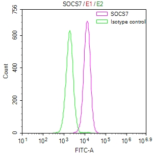 Overlay Peak curve showing HepG2 cells stained with CSB-RA594821A0HU (red line) at 1:50. The cells were fixed in 4% formaldehyde and permeated by 0.2% TritonX-100. Then 10% normal goat serum to block non-specific protein-protein interactions followed by the antibody (1μg/1*106cells) for 45min at 4℃. The secondary antibody used was FITC-conjugated Goat Anti-rabbit IgG(H+L) at 1:200 dilution for 35min at 4℃.Control antibody (green line) was rabbit IgG (1μg/1*106cells) used under the same conditions. Acquisition of >10,000 events was performed.