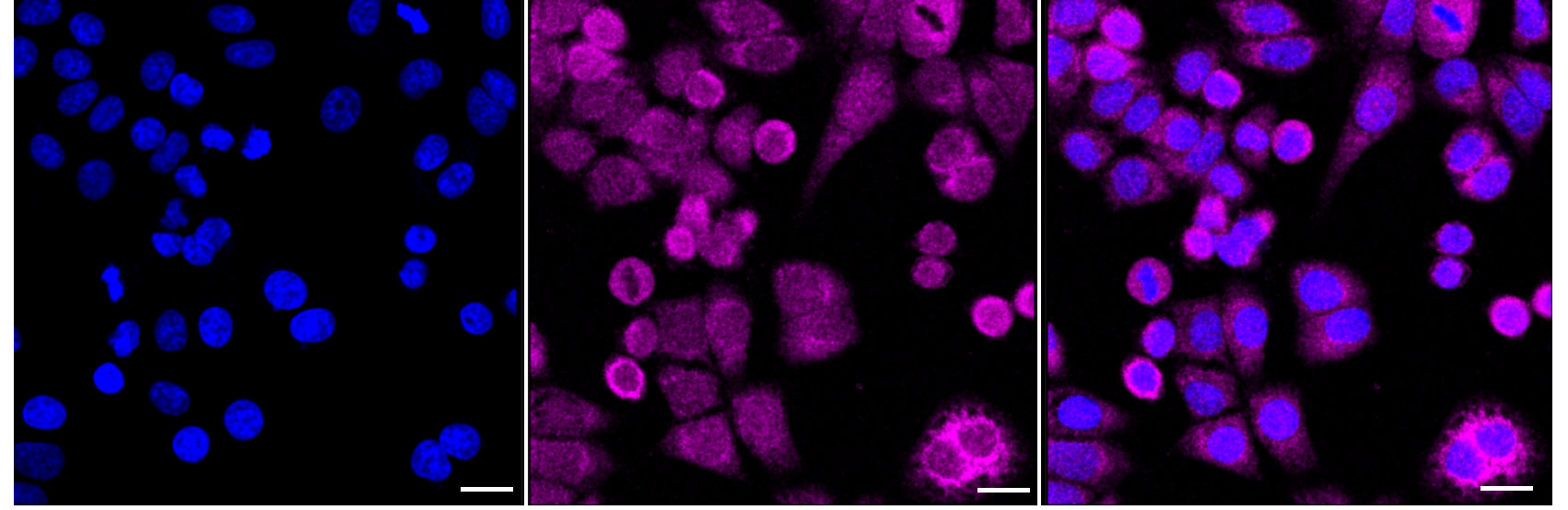 Immunocytochemical staining of HepG2 cells with Superoxide dismutase 1 antibody. Nuclei were stained blue with DAPI; Superoxide dismutase 1 was stained magenta with Alexa Fluor? 647. Images were taken using Leica stellaris 5. Protein abundance based on laser Intensity and smart gain: Medium. Scale bar: 20 μm.