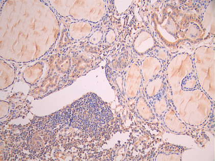 IHC image of CSB-RA859102MA1HU diluted at 1:50 and staining in paraffin-embedded human thyroid tissue performed on a Leica BondTM system. After dewaxing and hydration, antigen retrieval was mediated by high pressure in a citrate buffer (pH 6.0). Section was blocked with 10% normal goat serum 30min at RT. Then primary antibody (1% BSA) was incubated at 4°C overnight. The primary is detected by a Anti-Human lgG, Fcy Fragment Specific labeled by HRP and visualized using 0.05% DAB.