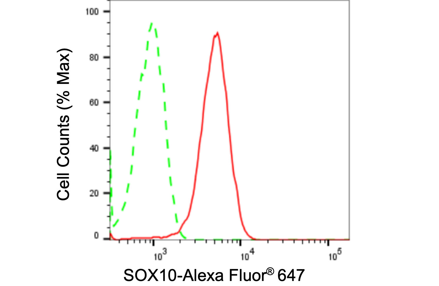 Flow cytometric analysis of SOX10 expression in HepG2 cells using SOX10 antibody. Green, isotype control; red, SOX10.