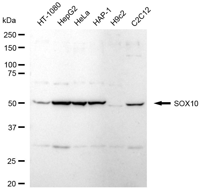 Western blotting analysis using SOX10 antibody. Total cell lysates (30 μg) from various cell lines were loaded and separated by SDS-PAGE. The blot was incubated with SOX10 antibody and HRP-conjugated goat anti-rabbit secondary antibody respectively.