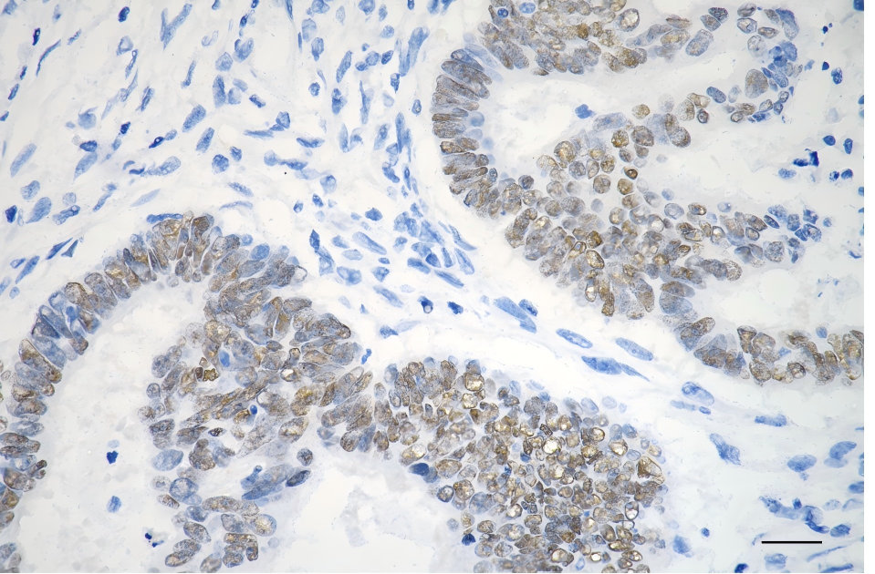 • Immunohistochemistry was performed on paraffin-embedded human sigmoid colon carcinoma using SOX9 antibody. Antigen retrieval was done in sodium citrate buffer (pH 6.0). DAB was used for detection, with hematoxylin counterstaining. Images were acquired using a Nikon Ci-L Plus microscope (40× objective). Scale bar: 25 μm.
