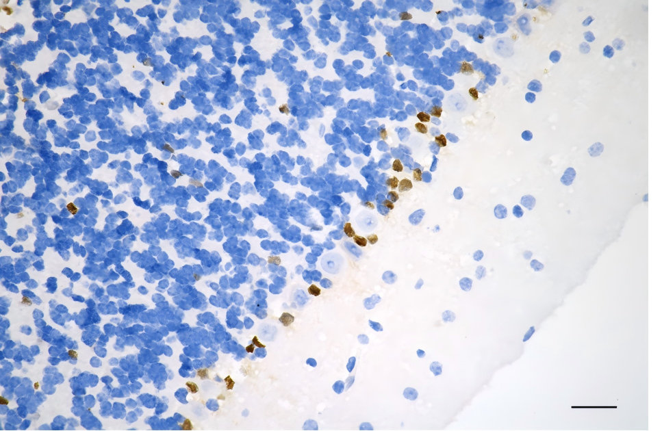 • Immunohistochemistry was performed on paraffin-embedded mouse brain using SOX9 antibody. Antigen retrieval was done in sodium citrate buffer (pH 6.0). DAB was used for detection, with hematoxylin counterstaining. Images were acquired using a Nikon Ci-L Plus microscope (40× objective). Scale bar: 25 μm.