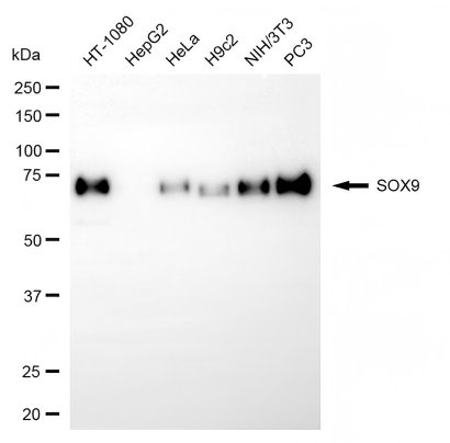 • Western blotting analysis using SOX9 antibody. Total cell lysates (30 μg) from various cell lines were loaded and separated by SDS-PAGE. The blot was incubated with SOX9 antibody and HRP-conjugated goat anti-rabbit secondary antibody respectively.