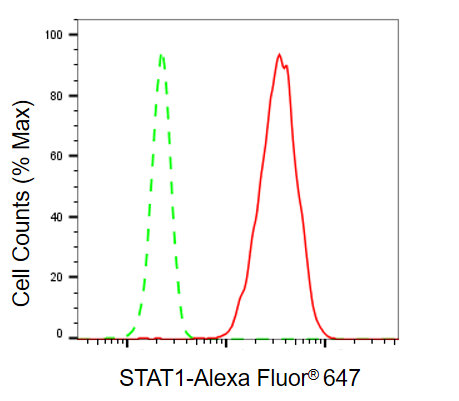 • Flow cytometric analysis of STAT1 expression in HeLa cells using STAT1 antibody. Green, isotype control; red, STAT1.